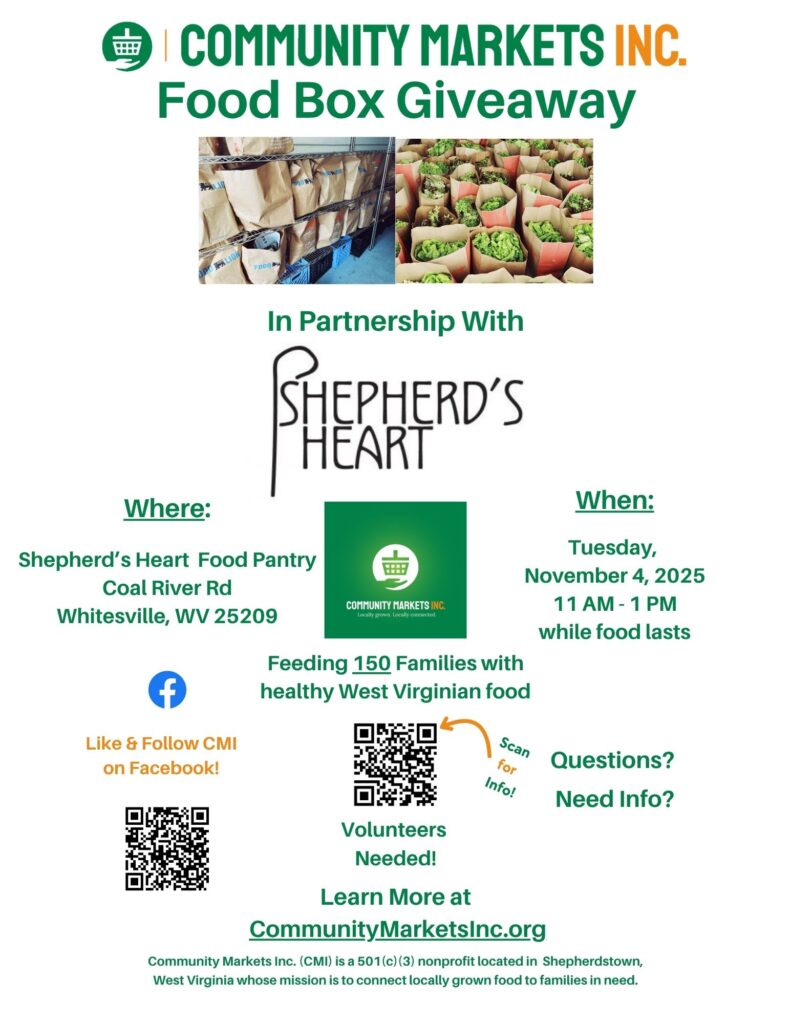 Whitesville, WV – November 4, 2025 – Community Markets Inc. (“CMI”), a nonprofit organization based in Shepherdstown, West Virginia, is partnering with Shepherds Heart Food Pantry, to provide much-needed food support to families in Boone County. Together, the organizations will distribute 150 food boxes on Tuesday, November 4, 2025, from 11:00 a.m. to 1:00 p.m. at Shepherds Heart Food Pantry, located on Coal River Road in Whitesville. CMI will bring a cold storage trailer full of fresh and healthy staple foods sourced from local farms in West Virginia including: farm-fresh produce, milk, butter, eggs, cheese, meat, jam, and more!