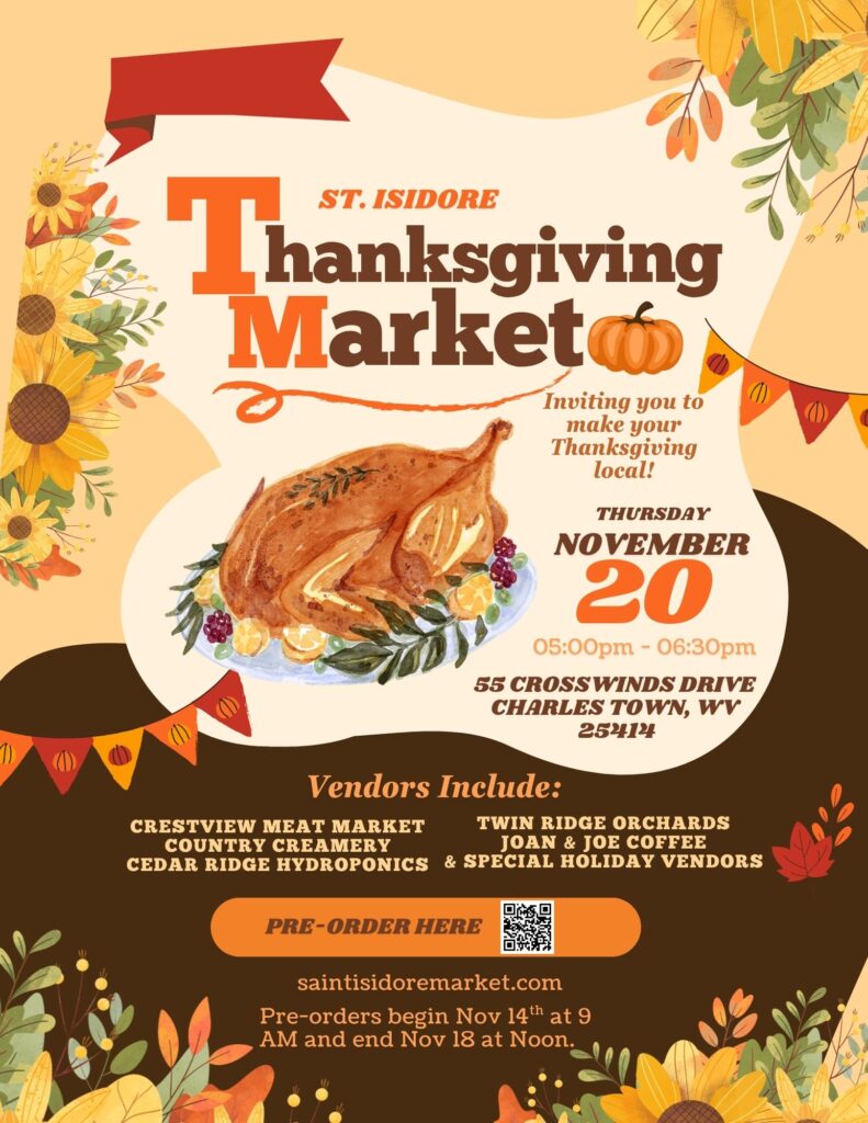 – Thanksgiving Markets. Think Local & Affordable this Thanksgiving with our special St. Isidore Thanksgiving Markets on November 20th & 26th! We’re taking pre orders now for fresh & local whole turkeys.