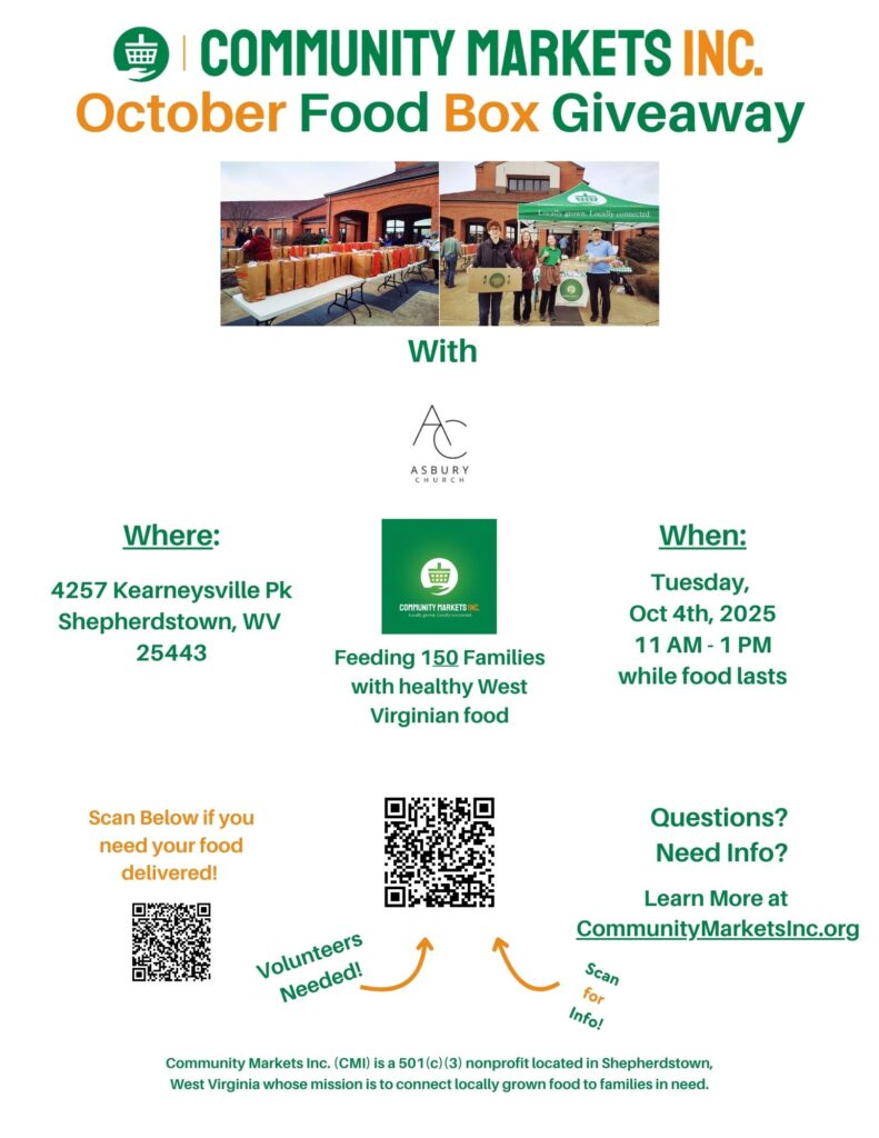 October’s second Food Box Giveaway is on Tuesday, October 28th at St. Leo’s Catholic Church in Inwood, WV. CMI is teaming up with Knauf to feed 150 families in southern Berkeley County!